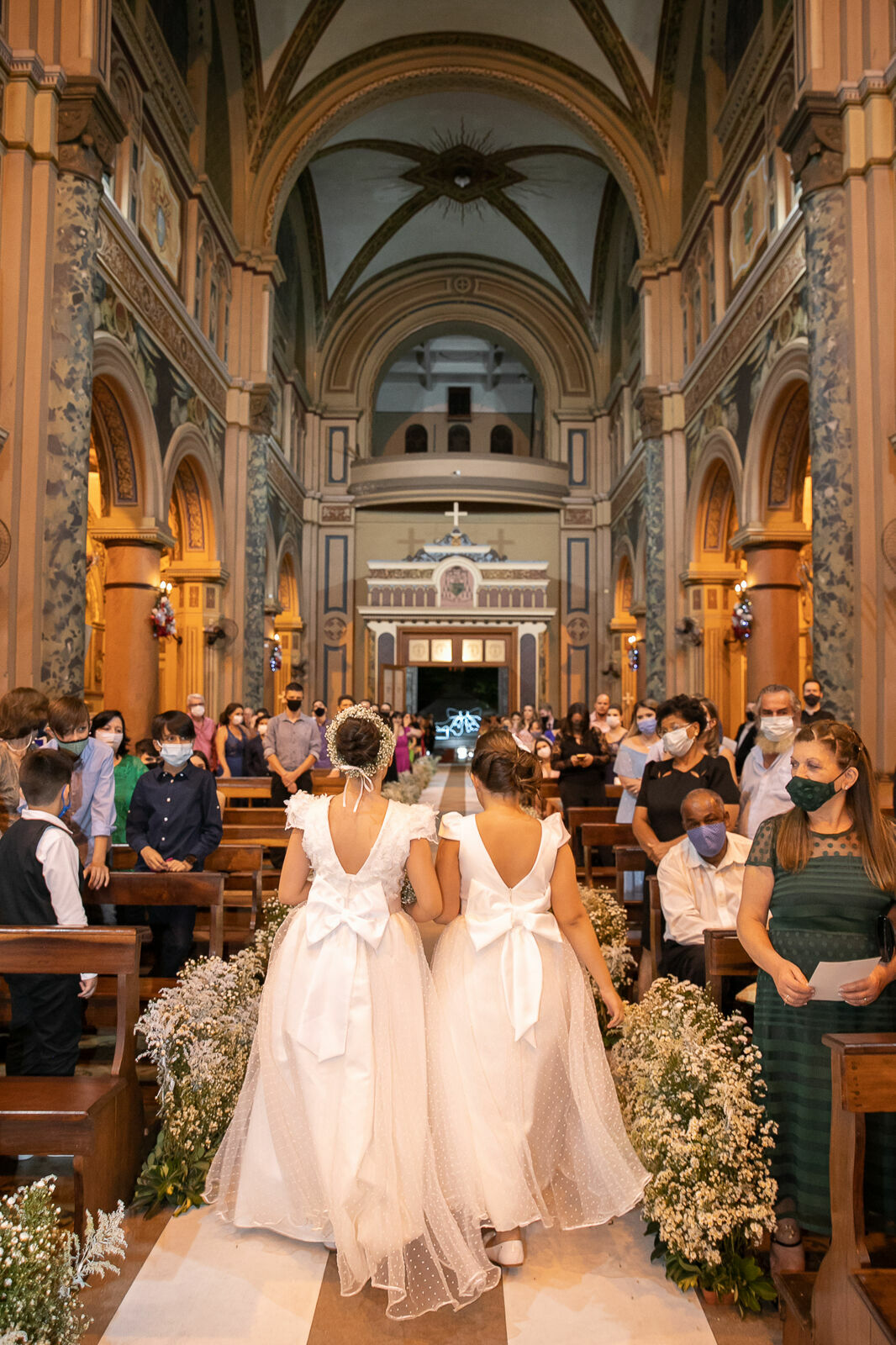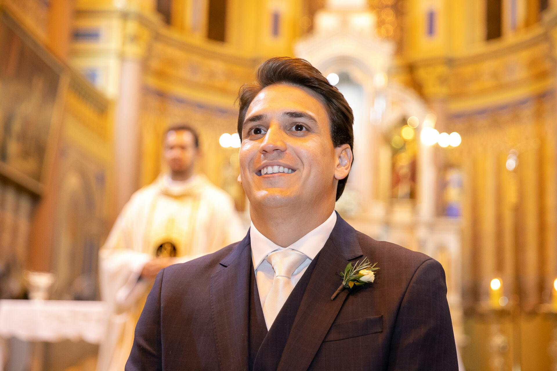 Este casamento foi realizado na Catedral de Ribeirão Preto, com sua luz característica amarelada. Uma igreja grande e bela.