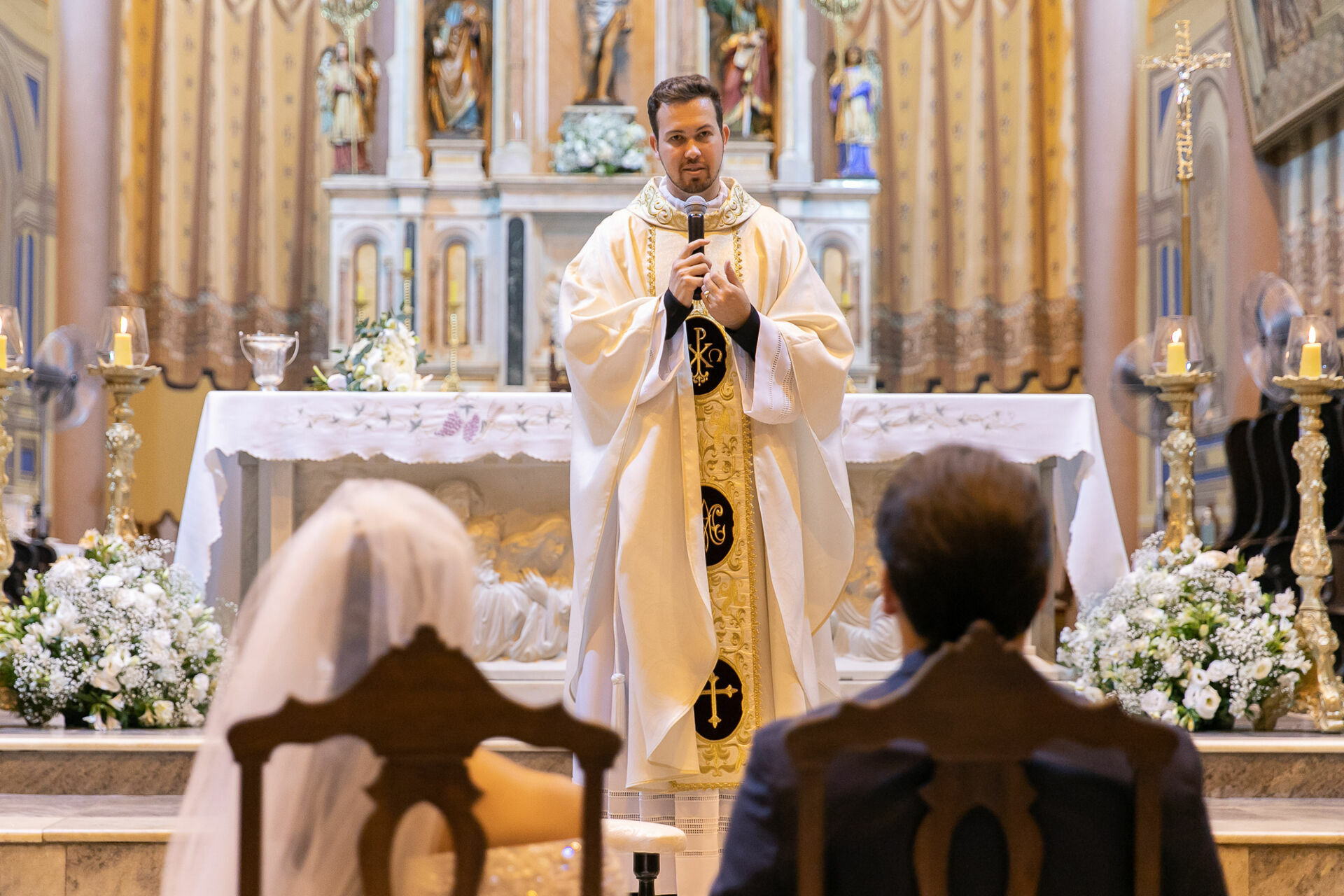 O casal ministram nesta igreja, por isso a escolha. Na cerimônia foi rezada uma missa completa, no final, compartilharam com seus convidados queridos.